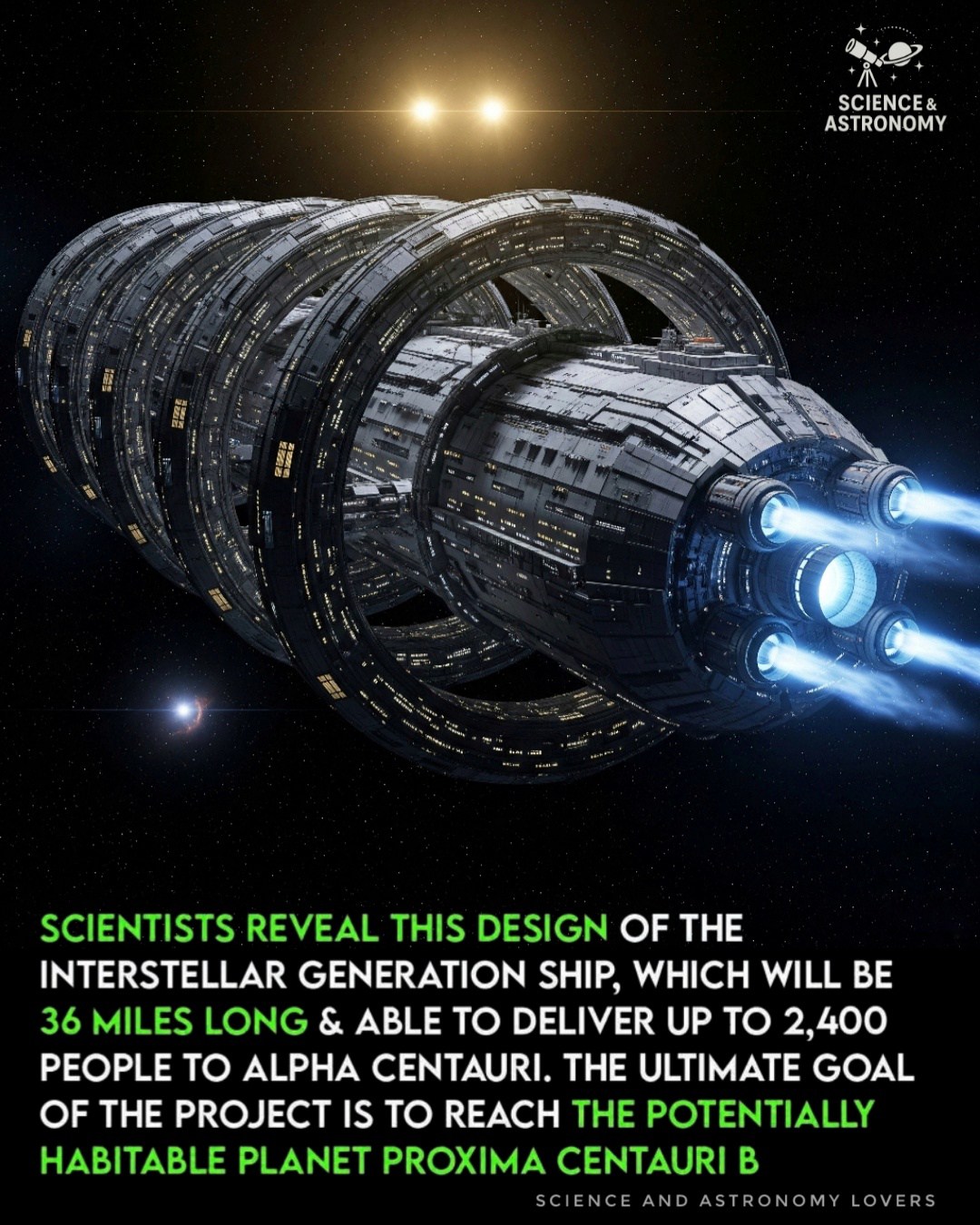 The ship is designed to support 1,500–2,400 people, including scientists, engineers, farmers, medical staff, and educators. Rotating rings along the ship generate artificial gravity via centrifugal force, mitigating the health risks of long-term weightlessness. Advanced closed-loop life-support systems recycle air, water, and food, while onboard biomes include tropical forests, boreal woodlands, and agricultural zones to supply nutrition and maintain psychological well-being.